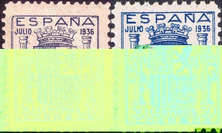 Lo que sí puedo decirte es que es un FF poco común del que existen ejemplares impresos en tinta azul y en tinta negra y de ambos te muestro, además, los sin dentar que el bergante de turno hizo para más jorobar al personal...