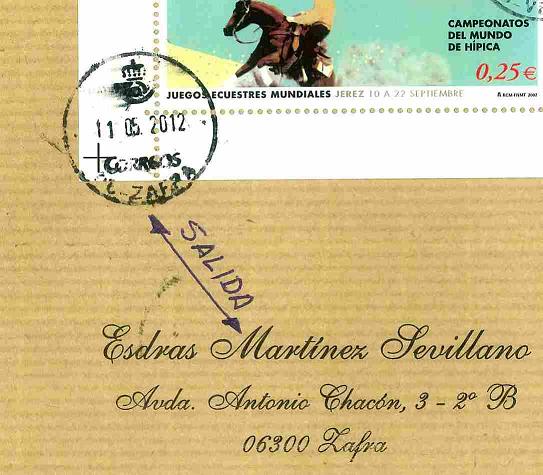 La carta sale de Zafra (Badajoz) a Velada (Toledo) en el mes de mayo, pero según los dos fechadores de la esquina tienen fecha 11 -05- 2012, es decir que hasta el año que viene no sale: