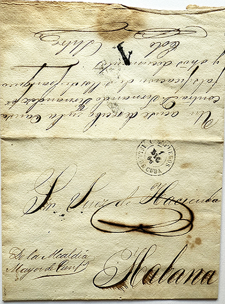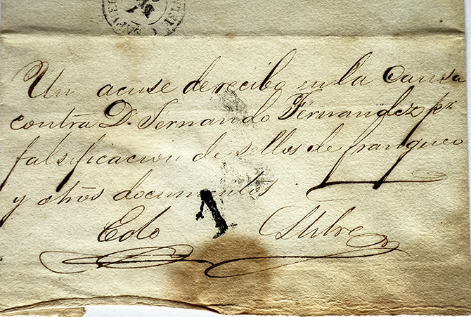 Es un fragmento de envuelta (no hay nada más al reverso) del envío desde la Alcaldía Mayor de Cienfuegos al Juez de Hacienda de la Habana (Cuba). Se indica que contiene un acuse de recibo de una causa de un falsificador postal. Tenemos el nombre del falsificador y se supone que se correspondería con efectos hasta ese año o anteriores.