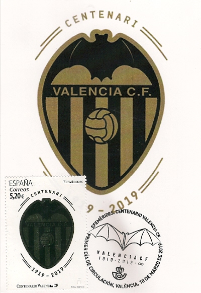 Emisión: Efemérides. Centenario del Valencia Clud de Fútbol. 18/03/2019. Offset + foil + golpe seco + barniz. Hoja Bloque. Facial 5,20€.