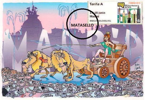 El siguiente boceto, postal comprada en la plaza mayor hace unos días, ATM previsto de los dos que se pondrán a la venta en la próxima Feria en la Plaza Mayor... ¿Se podría considerar máxima? El tema es el "Humor Gráfico", y el matasello todavía no lo sabemos.
