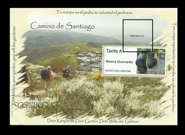 La del Xacobeo 2021, debería de haber puesto el ATM más abajo, no pensé en el tamaño del matasello, La tinta no se ha corrido mucho, con lo que entiendo que en la Oficina de Santiago han sido pacientes, ¡Gracias! Esta yo la consideraría máxima, esperemos que el Sr. Casas se pase por aquí algún día y nos dé su opinión. Además de que realmente queda bonita al ser una tarjeta reutilizada y tener relación los tres motivos (sello, postal y matasello)