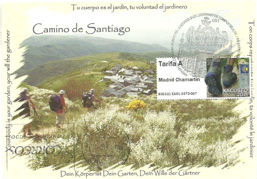 Para acabar por hoy, quiero reciclar una postal del camino de Santiago, postal enviada en 2017, y que el CTA por donde pasó canceló en la parte delantera.
