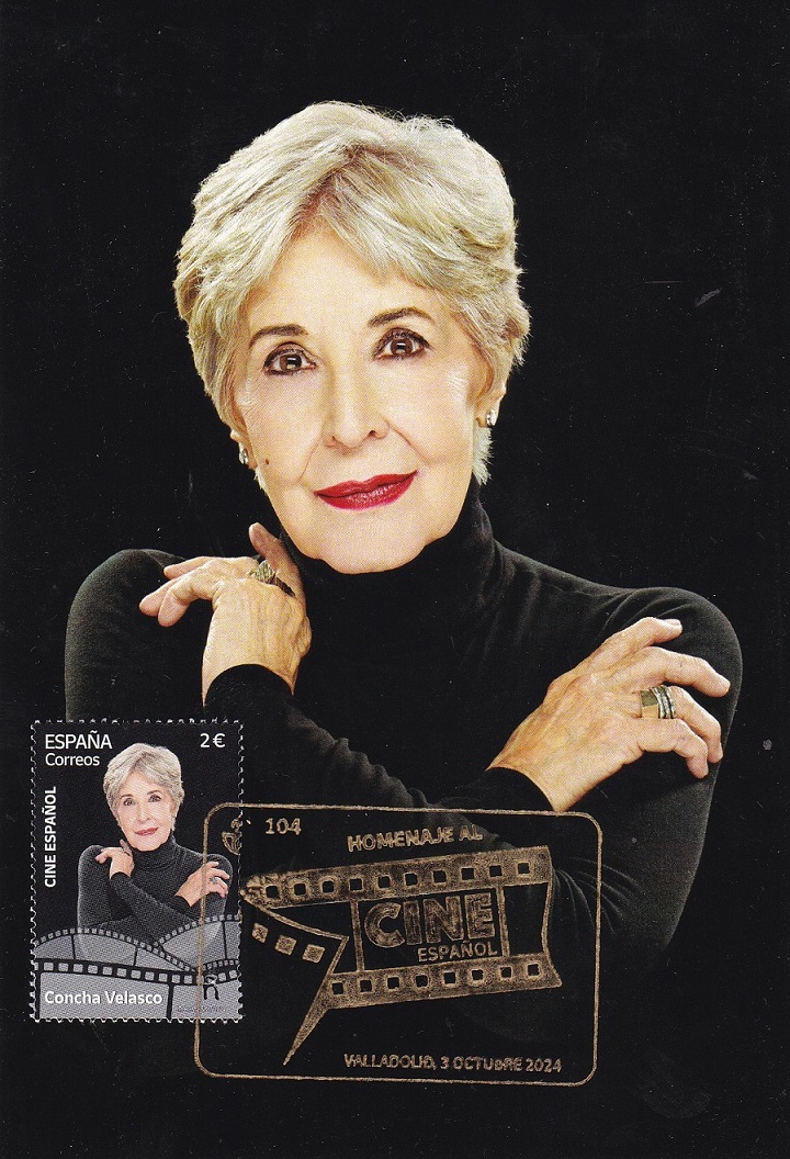 3ª Con sello de Concha Velasco, postal prefanqueada de Concha Velasco, cancelación primer día de circulación del sello, Cancelación especial en dorado Homenaje al Cine el 03 de Octubre 2.024, ya que el suyo en negro no se vería nada al ser la postal tan oscura, ciudad donde nació la actriz y cantante. Al ser prefanqueada pongo el reverso.