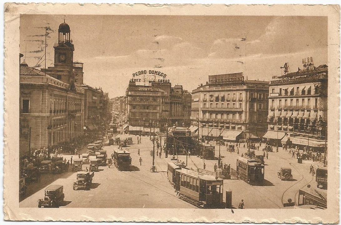 Subamos el tema con unos tranvías por la Puerta del Sol de Madrid en postal utilizada el 19 de abril de 1935
