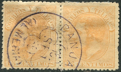No he podido demostrar la existencia de fechadores de 1882 en Canjáyar, Sorbas y Nacimiento y tengo dudas de sillegarona existir en Gádor y Alhama de Almería. En cuanto a los fechadores de tipo trébol, me consta su existencia en Vera, Canjáyar, Huercal Overa, Cuevas de Vera y La Garrucha, y supongo que se utilizaron sobre el pelón también en Adra, Berja, Purchena y Sorbas. De Adra y Dalías tengo mis dudas porque, aunque tuvieron fechador del tipo de 1882 (quizá a partir de 1889) aparecen como carterías en el mapa de 1865, no figuran en el de 1873 y tampoco en la relación de estafetas de 1888. En cuanto a Gérgal y Nacimiento, constan sus matasellos de cartería del tipo de 1889 en el Sabariegos, pero a su vez aparecen relacionadas como estafetas en 1888 y 1889 y, además, en el primer caso puedeo demostrar que tuvo fechador del tipo de 1882 (posiblemente a partir de 1889) y en el segundo tengo constancia de que se empleó el fechador trébol en las emisiones de Alfonso XII.