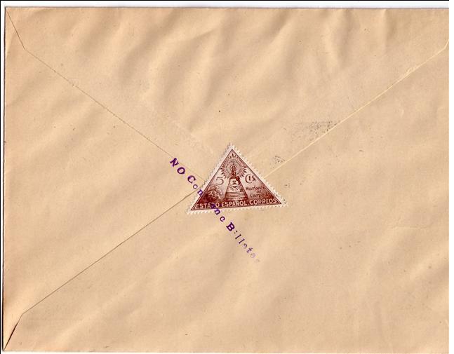 No había entrado yo en este hilo. Pero como son rarillas las cartas en cuyo franqueo aparece algun triangular de la Virgen del Pilar, de los benéficos de Huérfanos de Correos, os muestro la única que tengo.
