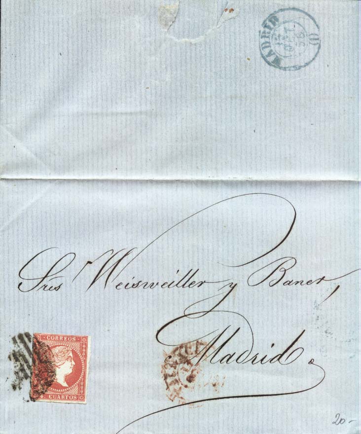 1856.-Edifil 48 matasellos parrilla de ¿? a Madrid, con fechador de llegada.