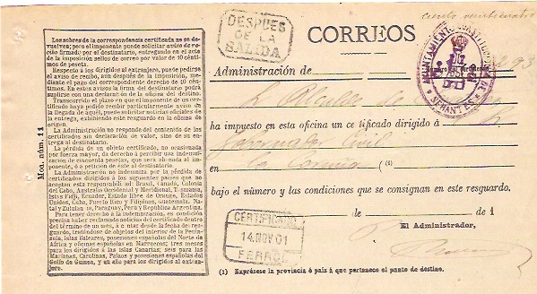 14.Nov.01.Resguardo de certificado de la oficina de El Ferrol en la que se estampa la marca.
