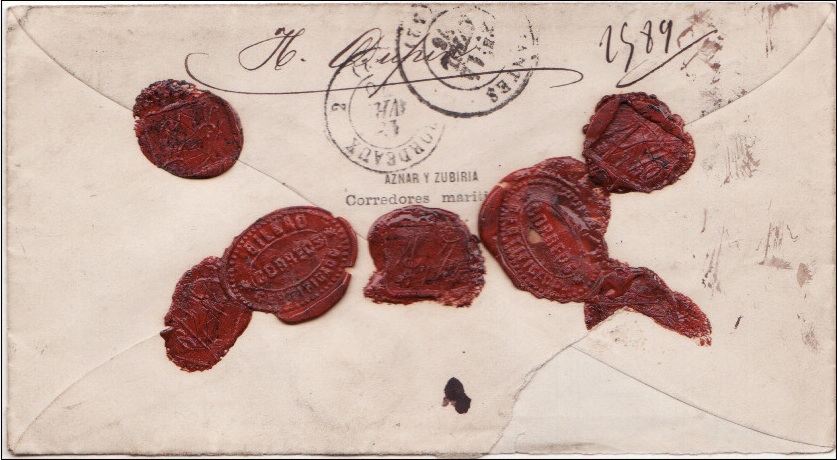 Al reverso, el rodillo de ??? de fecha 15 de junio "Después de la salida", y dos fechadores, de la Estafeta Oficial de Madrid ?? de Junio y otro de SARRIA en Barcelona de fecha 19 de junio.
