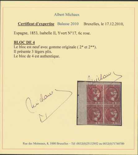 Con independencia del contenido de la certificación mostrada y de la exactitud de la misma, se puede ver en la página de la AIEP que nos a mostrado "jaumebp" que el señor Michaux es un experto en sellos de Bélgica, que los desde el año 1998 y que es miembrod e la AEIP desde el año 2003.
