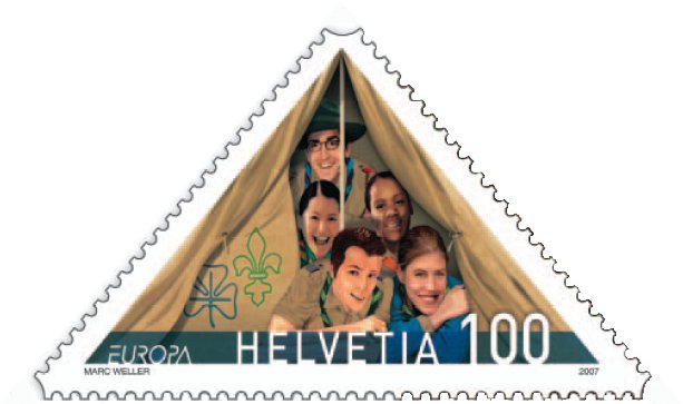 Entre la multitud de sellos emitidos en 2007 para conmemorar el Centenario del Escultismo, aprovechado por los correos de todo el mundo mundial para ganar pasta gansa, Suiza consideró conveniente hacer un único sello, triangular. Un sello bonito, original y muy moderno. Claro, que el pliego tambien es muy original. Y algunos hemos picado