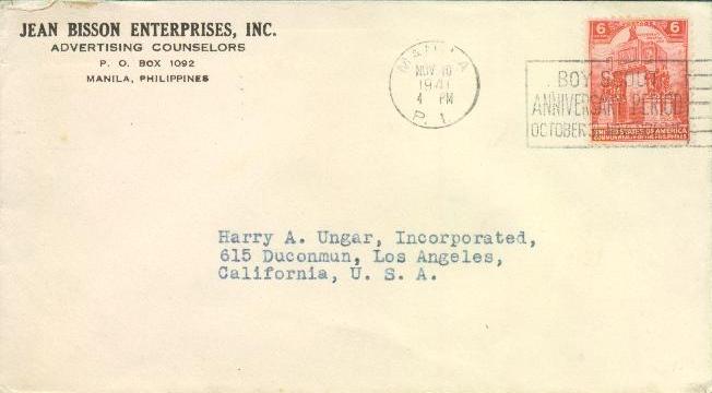 En esta ocasión pongo el último. Utilizado el 10 de noviembre de 1941, es decir menos de un mes antes de la invasión japonesa de las Filipinas, que se produjo el 8 de diciembre.