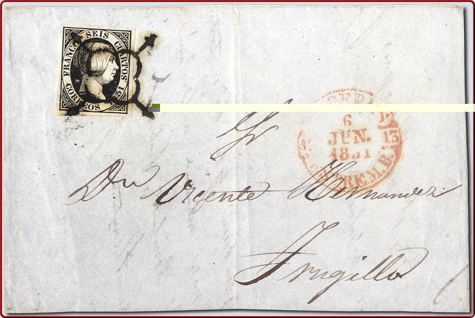 Frontal del 6 de Junio de 1.851 dirigido a Trujillo (todos están dirigidos a esta ciudad) con el Baeza de Cáceres en rojo ...