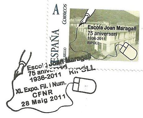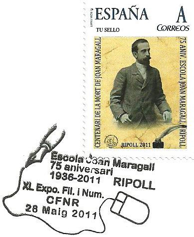 SEllos personalizados emitidos ayer 28/05/2011 en Ripoll, dedicados al 125 aniversario del poema de J. Verdaguer, Canigó; al centenario de la muerte del poeta Joan Maragall i Gorina y al 75 aniversario de la Escola Joan Maragall, de Ripoll.