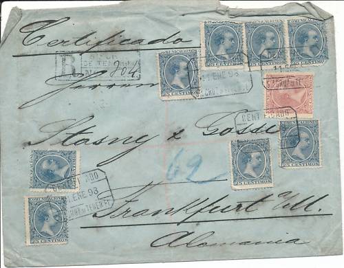 Es una carta certificada desde Barcelona a Colón en Colombia con trásito por Londres con un franqueo realmente espectacular y creo que digno de aparecer en este hilo. Espero que os guste.