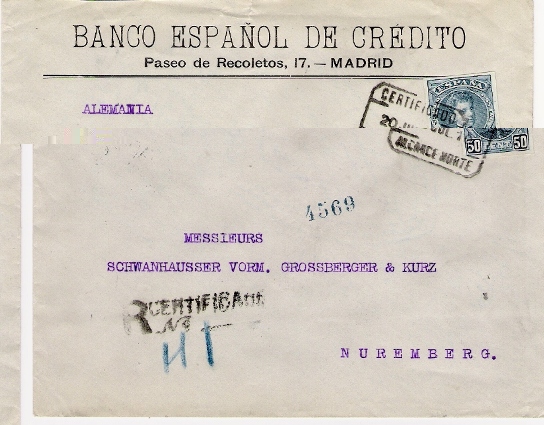 Aquí os pongo una carta realmente circulada en 1910 de Madrid a Alemania, certificada, no filatélica, con un sello sin dentar de 50 cts. Alfonso XIII tipo "Cadete". Matasellos de certificado "Alcance Norte" de Madrid.