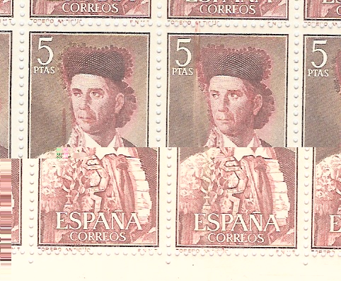 Subo un par de sellos de la serie de toros que están en un pliego. El de la izquierda tiene una línea de tinta y el de la derecha una especie de mancha de arriba a abajo que hace que en la zona donde entra en la chaquetilla le falte el color y sea gris, aunque en el escaner no se acabe de ver bien