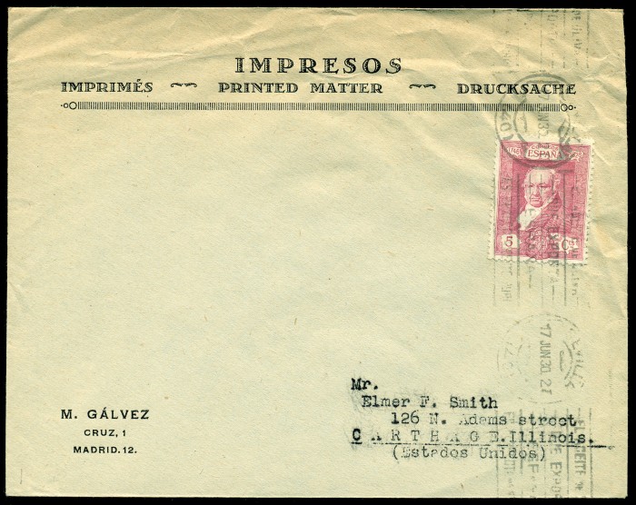 "1934 (4 June). San Sebastian - USA (28 June). Rarisimo sobre con tarifa y circulacion adecuada (llegada al frente) con sello 1 pta Maja de Goya. La rareza viene por el motivo que en su tiempo este sello fue considerado pornografico (!) y se rechazaron las cartas venidas de España con el mismo (puritarismo anglosajon). Pieza excepcional."