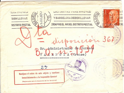 Incluyo una carta devuelta con etiqueta de devolución a la Inspección General, aludiendo a la disposición 367 del B.O. 1531. Seguro que nuestro amigo alfareva podra identificar la reglamentación y decirnos el porqué de la devolución de la carta que además fue abierta por los Servicios Moviles de la Dirección General de Correos en Madrid a su regreso de Galicia l
