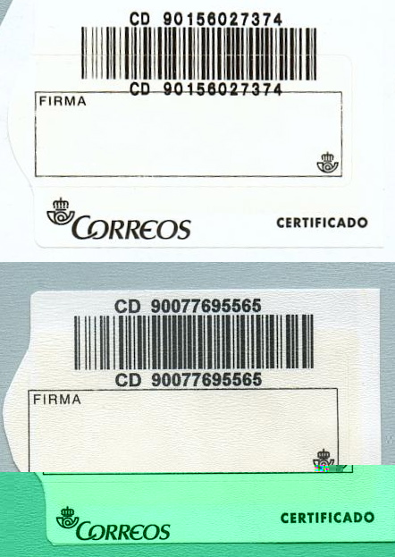 La segunda lleva el logotipo de "Correos". Esta etiqueta es una variante de la subida en la primera página (obsérvese que las siglas CD de aquella son más anchas)