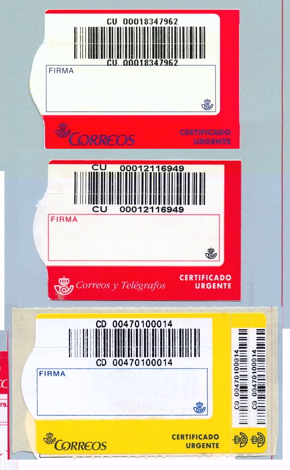 Con respecto a la etiqueta de CERTIFICADO con error de impresión ya que pone CERTIFICADO URGENTE, conviene añadir, por aquello de datarla y proporcionar algún dato, que un buen amigo, compañero del foro, la proporcionó allá por marzo del año 2008 indicando que cuando algún responsable de Correos se dio cuenta del error, al imprimir la denominación de la etiqueta, ordenó su retirada.