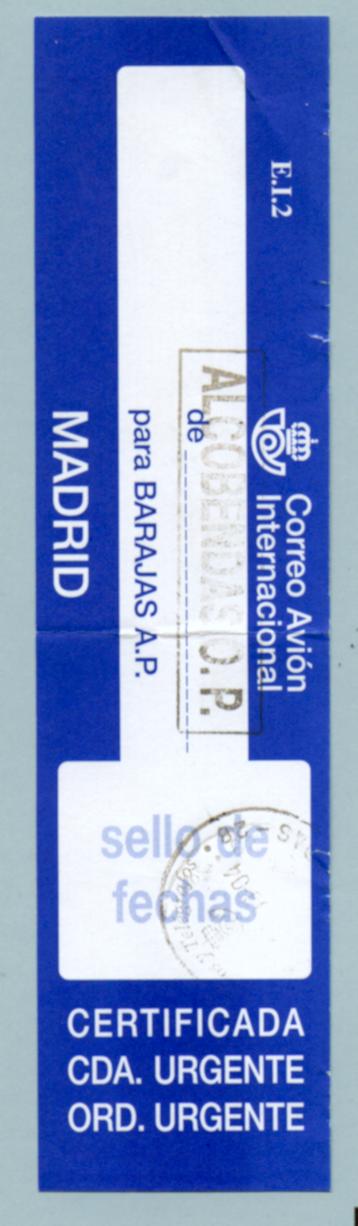 E.I.2 - Etiqueta en papel grueso y tinta azul fuerte. Es de régimen interior de Correos utilizada para el "Correo Avión Internacional" Esta lleva marcas de Alcobendas con fecha octubre 2004.