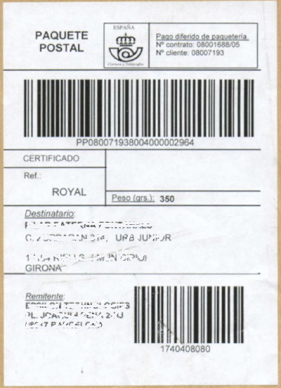 "Correos" letras azules sobre fondo amarillo. Estas son un error de impresión como lo denotan las siglas CD que significan "Certificado" pero la denominación es de Certificado Urgente. Además el Certificado urgente siempre está en color rojo, no amarillo.