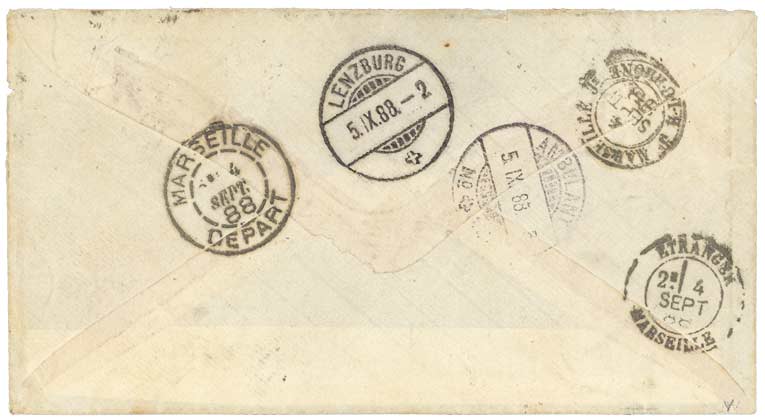 Carta de Tanger a Francia (1887), con el fechador tipo Puente del "CORREO ESPAÑOL / TANGER":