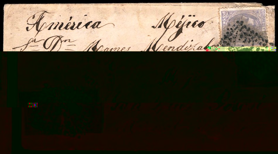 Carta de Laredo (Santander) a San Juan de Potosí (Méjico) franqueado con cuatro ejemplares del alfonsillo matasellados por rpmbo relleno de puntos y dos de ellos por fechador tipo trébol negro de Laredo. Al dorso varios fechadores de tránsito y llegda. Una de las más expectaculares piezas de este sello que he visto.
