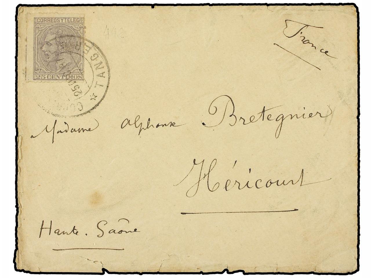A pesar de no puedo aportar algo más al tema del Alfonsillo quisiera aprovechar la ocasión de mostraros (y especialmente a nuestro amigo Julio) una cartita con Pelones a Francia con -como creo yo- el mismo rombo especial de Salvatierra usado (veinte años más tarde) en el diciembre de 1889. ¿Que os parece?