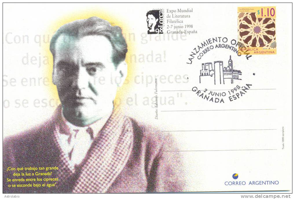 Como bien ha dicho el amigo Luis Angel, el 809 ya estaba en el hilo, y también he visto la serie de IFNI aunque os la mando de nuevo. Esta es el Entero Postal de Argentina sobre Federico García Lorca, el sello es el mosaico de la Alhambra, y el matasellos es algo parecido a la vista general de la Alhambra.