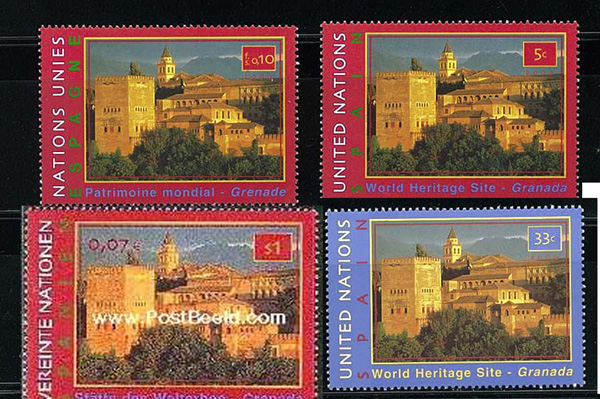 Estas dos imagenes corresponden a un carnet libro emitido por Naciones Unidas, en el de España, además de aparecer la Alhambra en la portada, le dedica una hoja de 4 sellos a los siguientes monumentos: