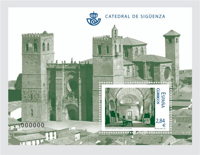 La Hoja Bloque de la Catedral de Sigüenza se puso en circulación en marzo de 2011, tiene una tirada de 280.000 ejemplares y su valor facial es de 2,84 euros. La impresión está realizada por el sistema de calcografía y offset, en papel estucado, engomado, mate y fosforescente. El formato del sello es de 40,9 por 28,8 mm.[hr]