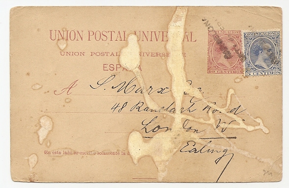 Entero postal con aumento de franqueo enviado en 1892 de Barcelona a Londres con un extraño matasello poco visible, pero probablemente sea el matasello lineal de Barcelona - Estación de Francia.