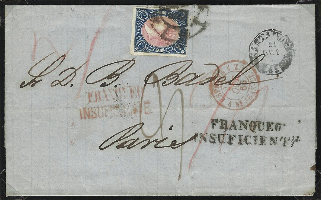 Se trata de 2 cartas, una de ellas frontal (Málaga) dirigidas a Francia, pero que tienen la peculiaridad de estar mal franqueadas (doble porte) y por eso lo de las marcas de "franqueo insuficiente. La de Santander que por cierto la "rueda" no es muy buena sino mas bien todo lo contrario :x lleva las marcas por duplicado y de diferentes oficinas.