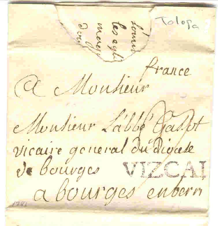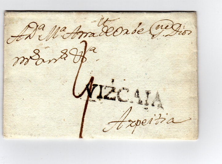 La mejor solucion para determinar si es marca nueva es poner una carta co la marca nº 3 de Tolosa ¿alguien la tiene, tu Fernando? al lado de esta que has subido y ver si son estampaciones iguales y Tizón la dibujó un poco desigualada en su PE, o realmente se ve en las piezas que son 2 cuños diferentes. El estar estampada en hueco de fechas desconocido, le da posibilidades claras de ser otro cuño, pues la A tiene el palo horizontal realmente alto en comparación con la ya catalogada, so pena que solo vemos una A de VIZCAIA.