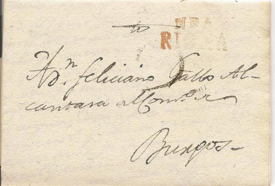 Pero hay otra marca inédita en color rojo que yo pensé sustituyó a la MDA/RIOXA en la Guerra de la Independencia (tal vez por haberse ausentado de la estafeta un responsable que se la llevó), pero al encontrar otro ejemplar en tinta negra en 1824, se me rompió la hipótesis.