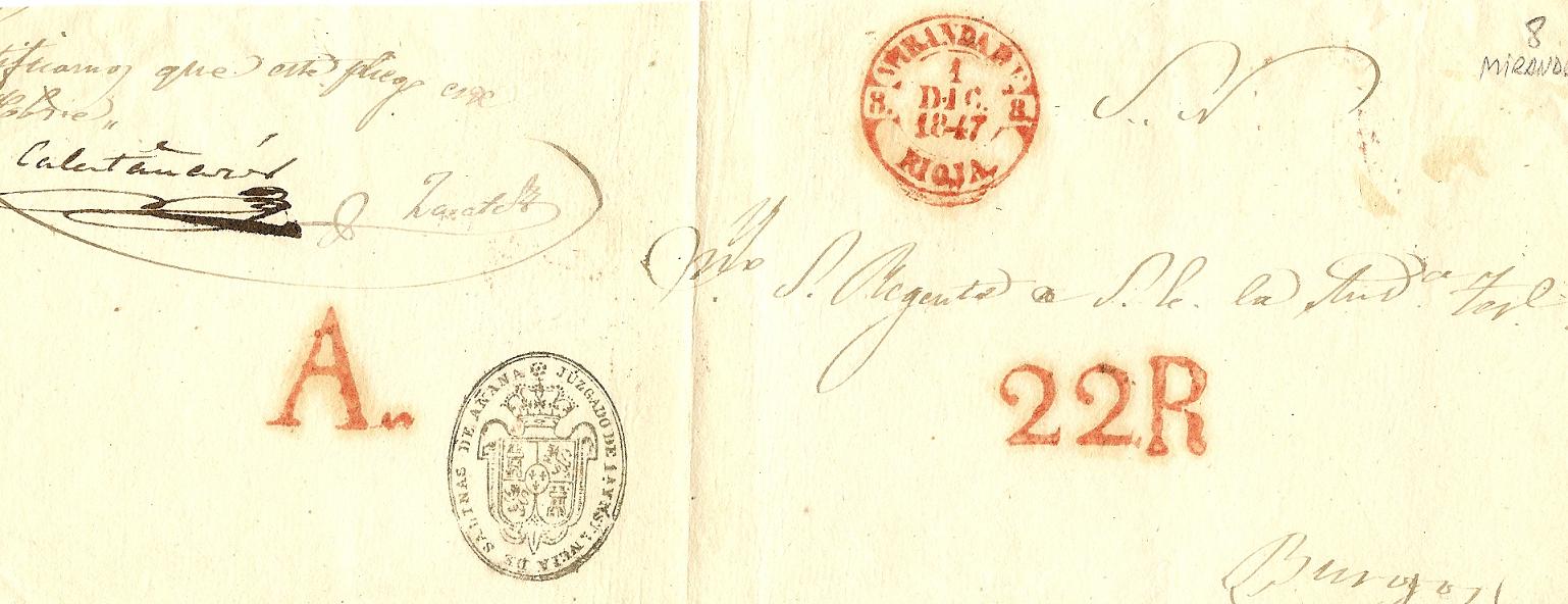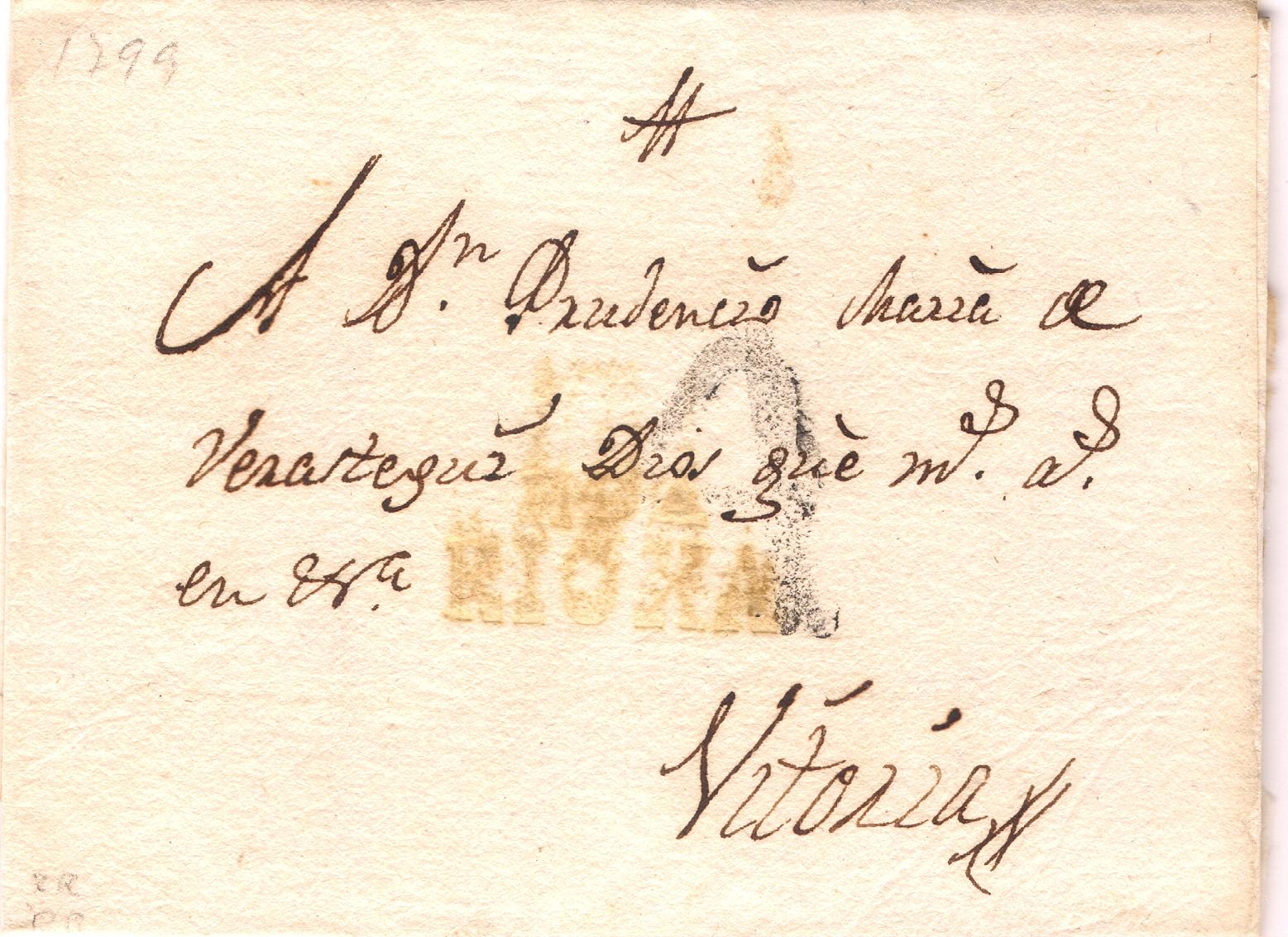 PE-2004 nº6, con años de uso 1815/17 y 1836/38 parece que se usó simultaneamente a veces con la marca anterior, MDA/RIOXA. Yo tengo dos: de 1821, Armiñón a Madrid,con porteo 7 negro de fecha, y de 1823, Miranda a Lequeitio, con porteo 6 grande rojo, de Vitoria.