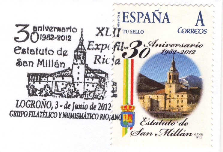 El Grupo Filatélico y Numismático Riojano ha emitido un sello personalizado (el número 12 de su colección), dedicado al 30 Aniversario del Estatuto de San Millán 1982-2012, con ocasión de la celebración de la XLII EXPOFIL-RIOJA, II Exposición Filatélica Regional, celebrada del 3 al 9 del presente mes de junio.