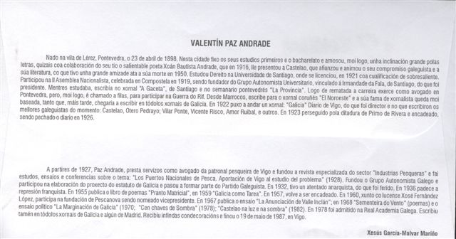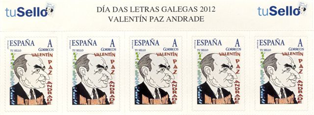 El Grupo Filatélico e Numismático de Noia, con ocasión de la celebración de la "Mostra Filatélica. Día das Letras Galegas. Valentín Paz Andrade" que tuvo lugar entre del 17 al 20 de mayo del año 2012, emitió un nuevo sello personalizado.