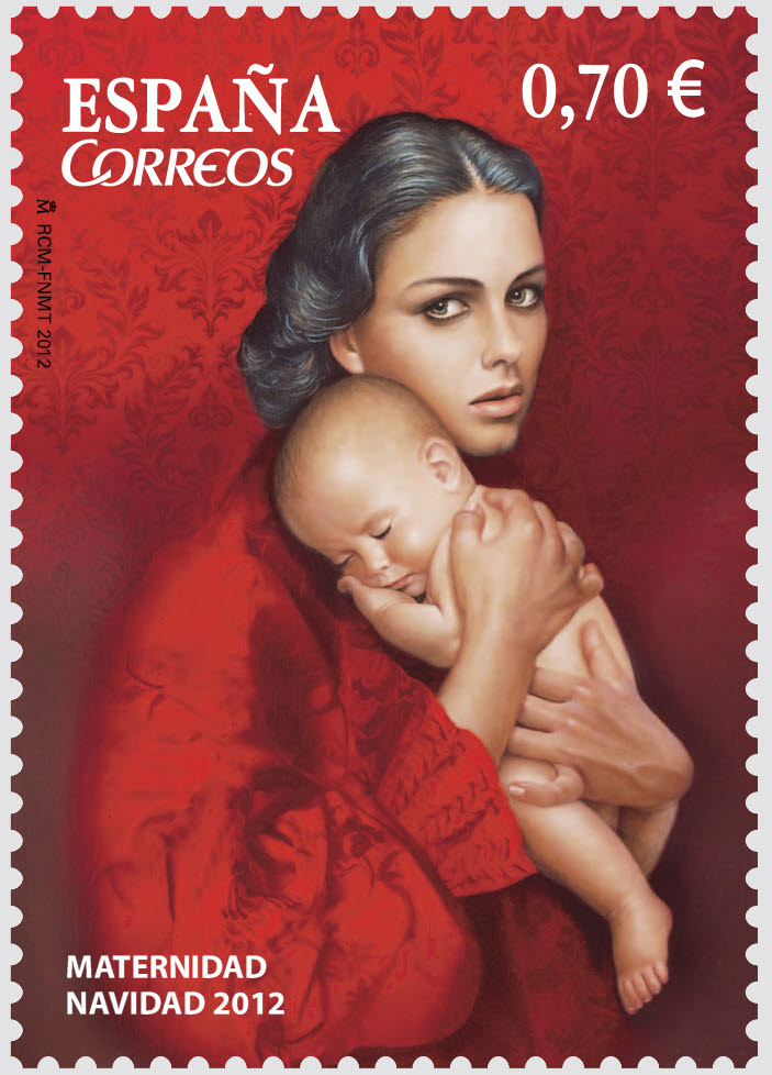 En el sello de 0,70 € se reproduce una escena denominada Maternidad, obra de J. Carrero.