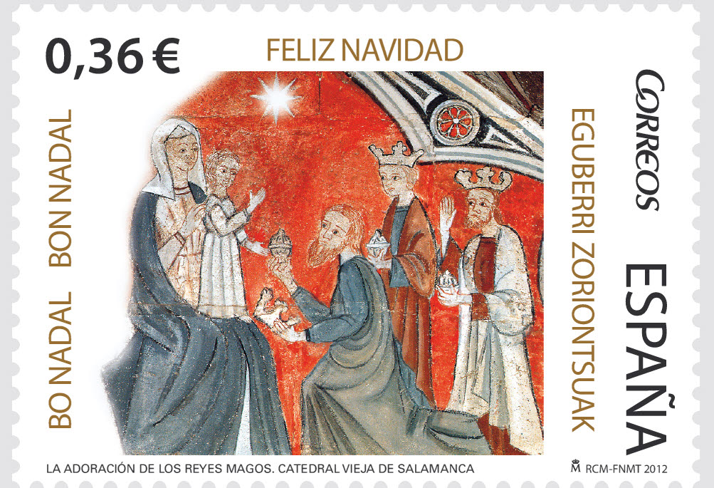 En el sello de 0,36 € se reproduce un fragmento de La Adoración de los Reyes Magos, que se conserva en la Capilla de San Martín, de la Catedral Vieja de Salamanca.
