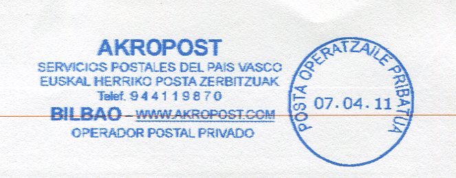 Otra: la bilbaina Akropost, esta si emplea los mismos tipos de franquedoras para cancelar sus envios, pero dependiendo de su gestión y entrega pasan por Correos o lo reparten ellos mismos. Si nos fijamos en las tres imágenes siguientes vemos las similitudes.