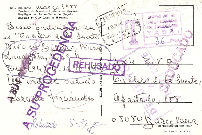 Subo una postal con unas cuantas marcas.La misma se rehusó ya que el organizador del concurso al que iba dirigida no se haría cargo de la tasa impuesta (36 pts.).