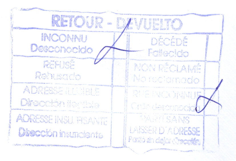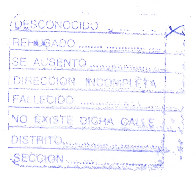 sin título (color azul), para indicar las causas de la devolución, (utilizada en Olot, Gerona, el 17/10/2012)
