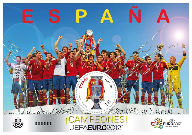 En el sello, que tiene formato circular, el Trofeo oficial de la UEFA y unas cintas con los colores de la bandera de España.