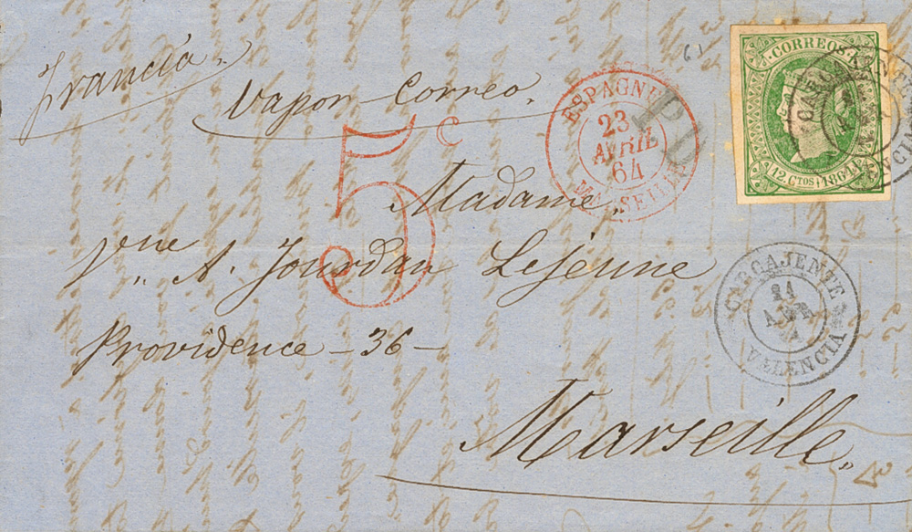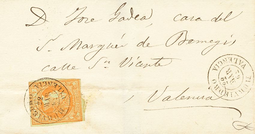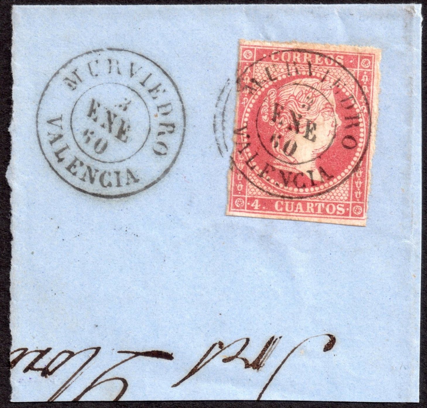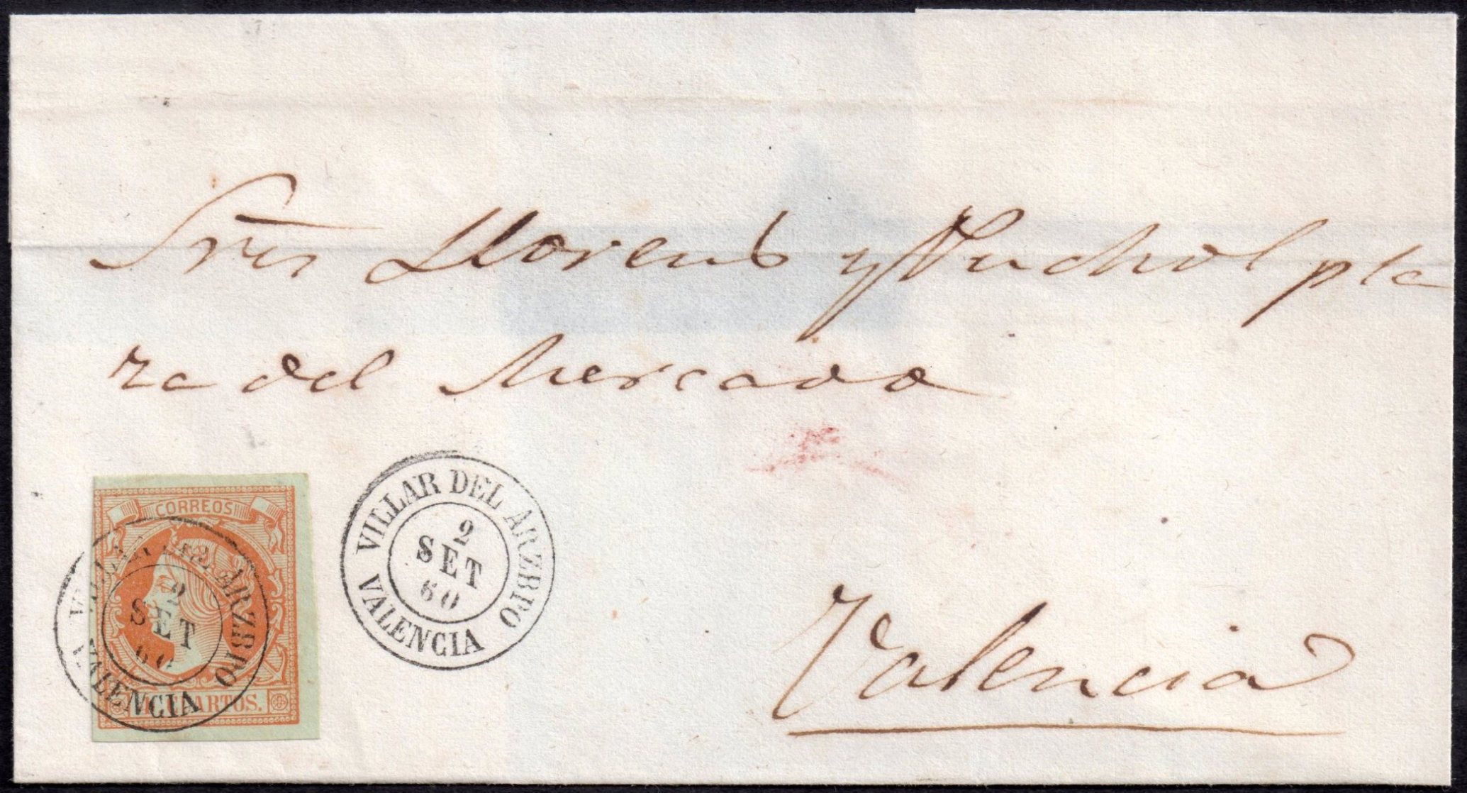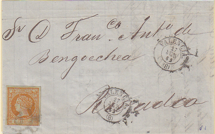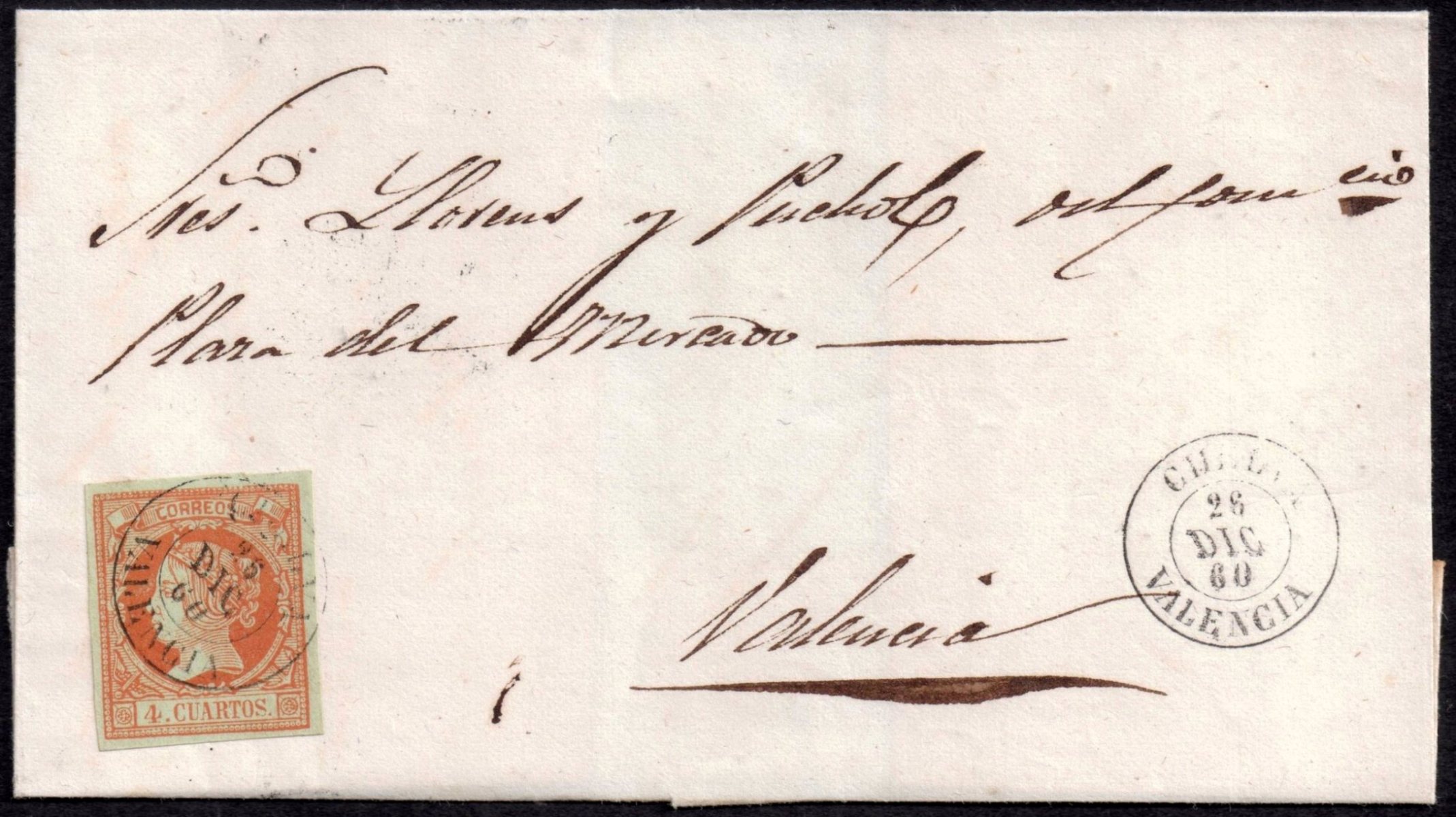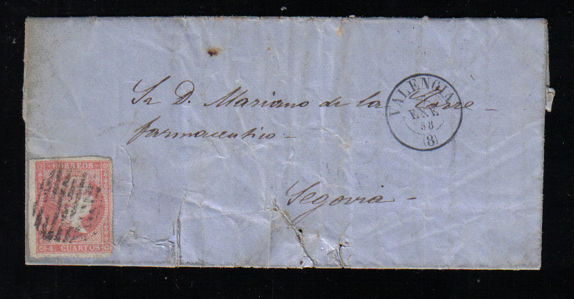 Valencia en carta a Segovia, sello de 4 Cuartos de 1.856-59