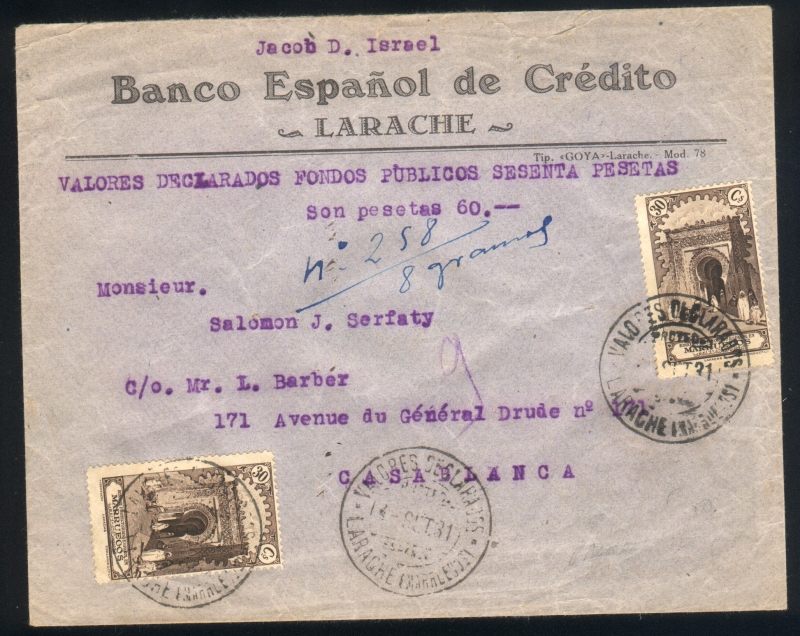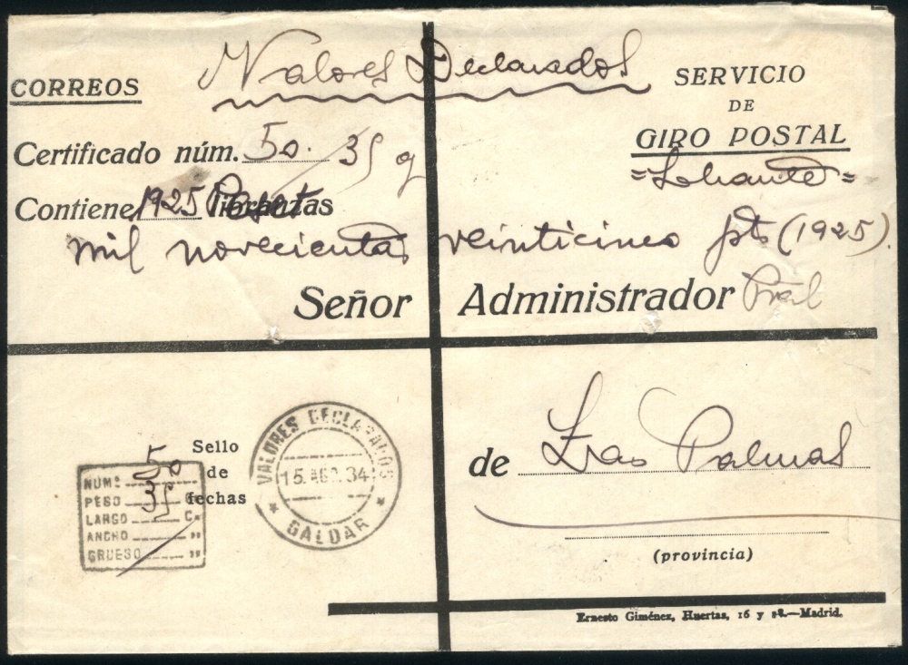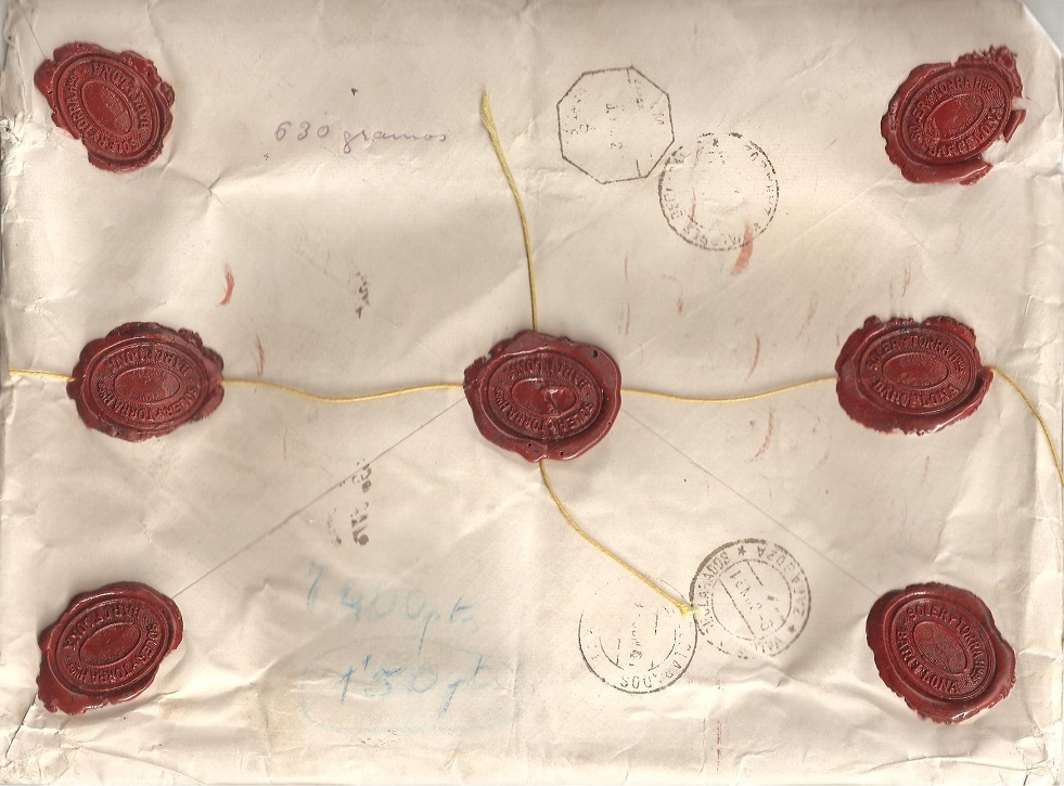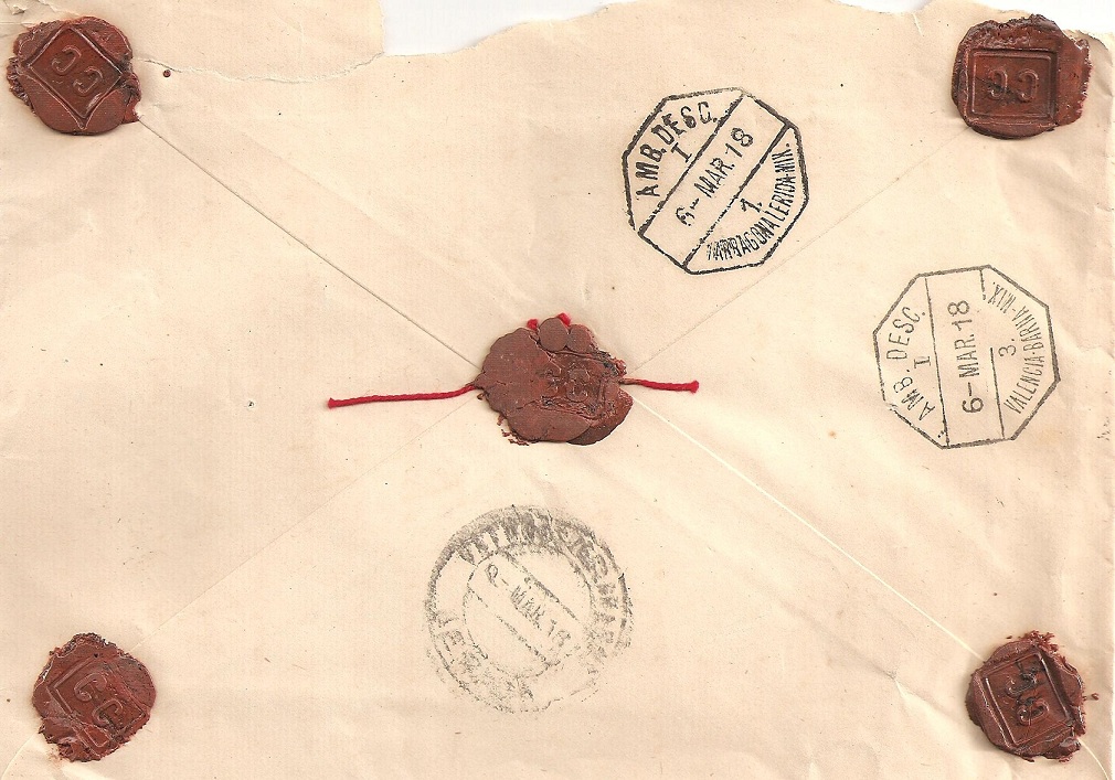 Valores declarados de 1.740 pesetas (= 730 franco de oro) con un peso de 35 gramos. Franqueado con cinco sellos con un total de 1.95 pesetas.