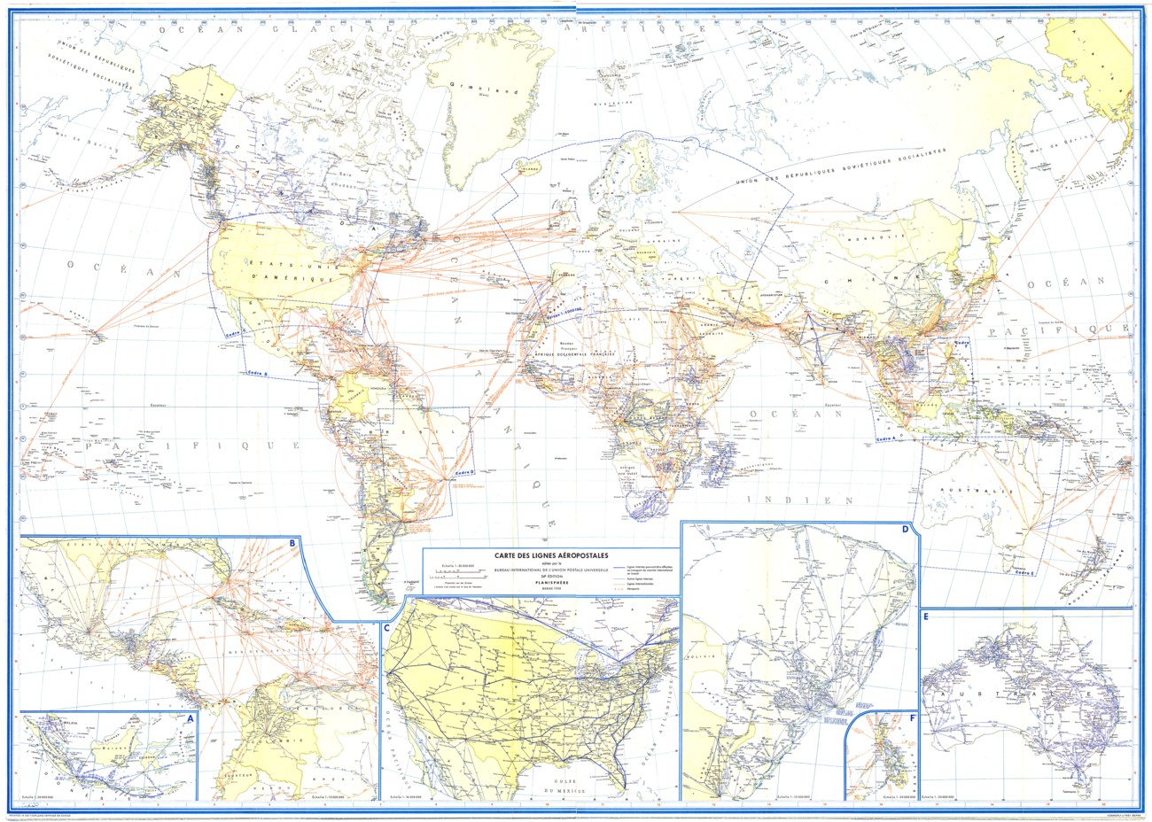 U.P.U., Mapa de líneas aeropostales mundiales, 1953.